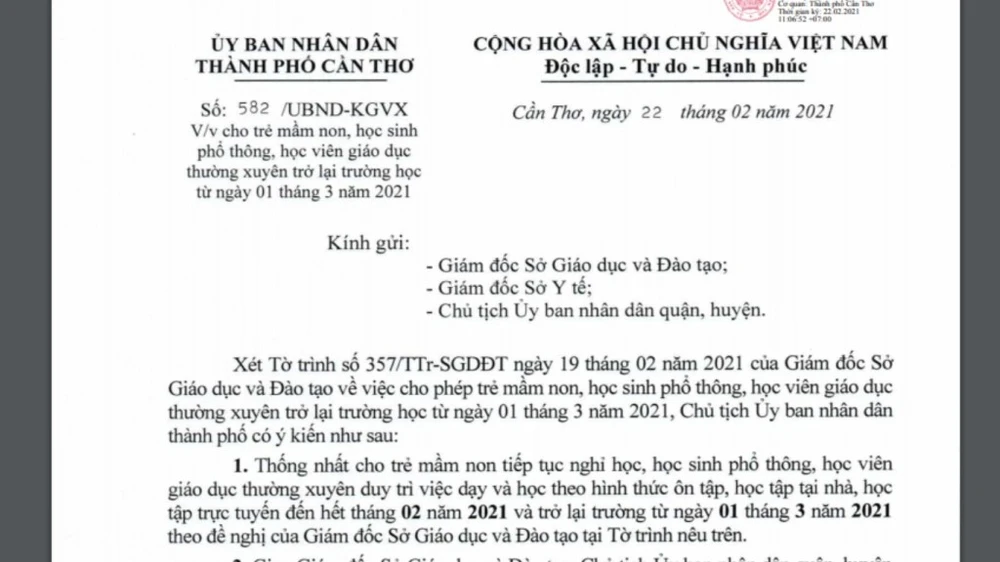 Ngày 22-2, UBND TP Cần Thơ có công văn về việc cho trẻ mầm non, học sinh phổ thông, học viên giáo dục thường xuyên trở lại trường học từ ngày 1-3-2021 gửi Giám đốc hai Sở GD&ĐT và Y tế, Chủ tịch UBND quận, huyện.