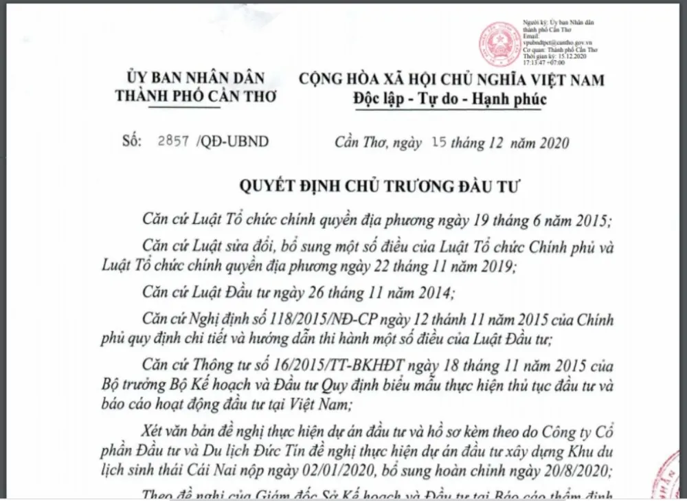 Ngày 15-12, UBND TP Cần Thơ ban hành quyết định chủ trương đầu tư Khu du lịch Cái Nai. Theo đó, UBND TP chấp thuận nhà đầu tư là Công ty CP đầu tư và du lịch Đức Tín đầu tư dự án Khu du lịch sinh thái Cái Nai.
