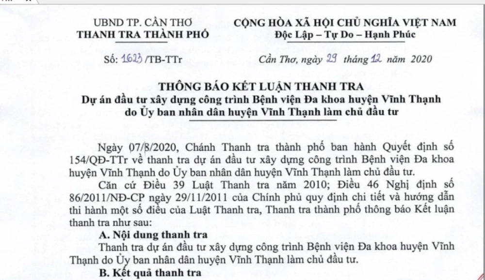 Thông báo kết luận thanh tra dự án đầu tư bệnh viện huyện Vĩnh Thạnh. Ảnh: NHẪN NAM