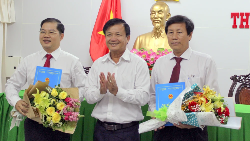 Ông Đào Anh Dũng, Phó Chủ tịch thường trực UBND TP Cần Thơ, trao quyết định bổ nhiệm cho ông Nguyễn Khánh Tùng (bìa trái) và ông Cao Minh Chu (bìa phải).