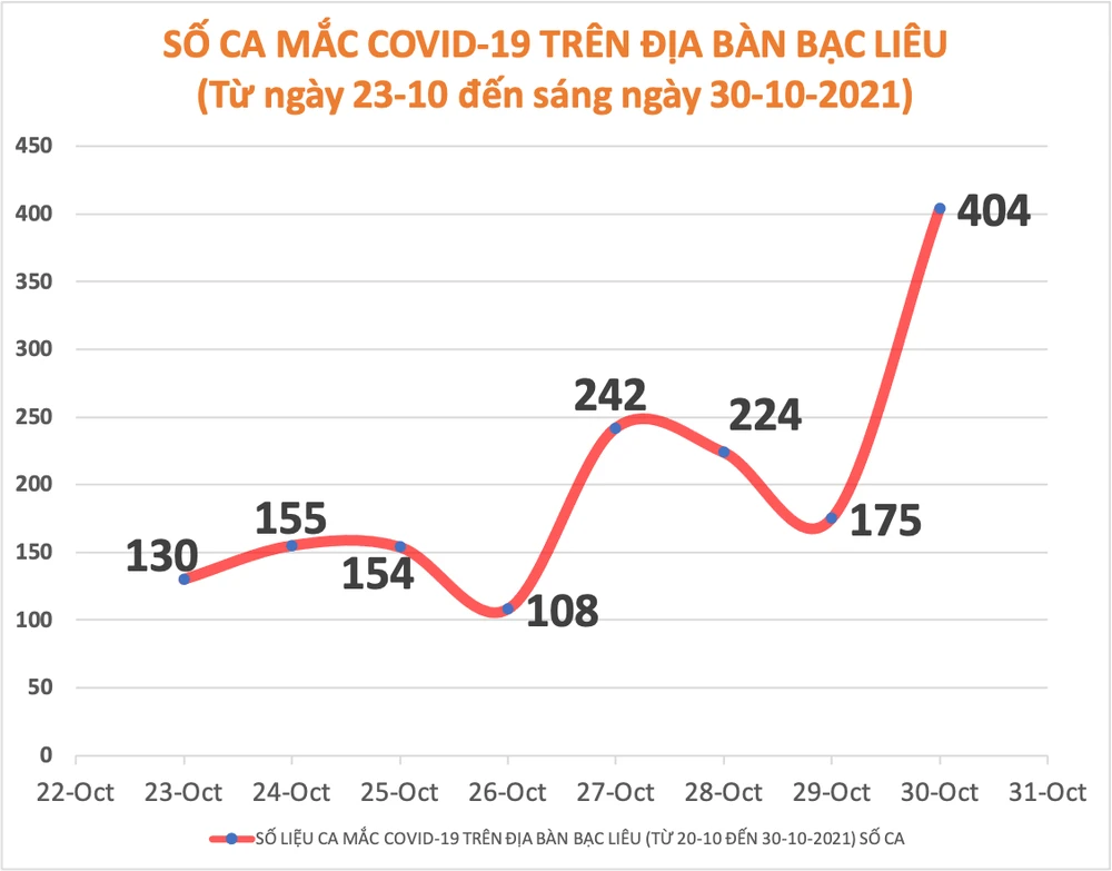 Số ca mắc COVID-19 trên địa bàn tỉnh Bạc Liêu từ ngày 23-10 đến 30-10, trong đó ngày 30-10 số ca mắc tăng đột biến với 404 ca.