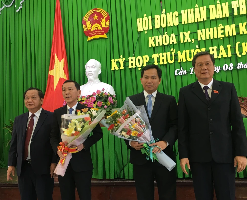 Bí thư Thành uỷ và Chủ tịch HĐND TP Cần Thơ tặng hoa các ông Võ Thành Thống và ông Lê Quang Mạnh.