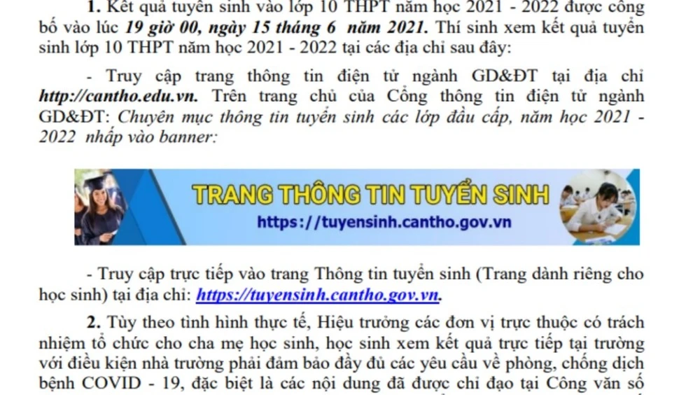 Cụ thể, kết quả tuyển sinh vào lớp 10 THPT năm học 2021-2022 được công bố vào lúc 19 giờ ngày 15-6-2021. Thí sinh xem kết quả tuyển sinh lớp 10 THPT năm học 2021-2022 bằng cách truy cập trang thông tin điện tử của Sở tại địa chỉ http://cantho.edu.vn Tại trang chủ của trang này, thí sinh chọn vào banner TRANG THÔNG TIN TUYỂN SINH sẽ dẫn đến một trang mới dành riêng cho học sinh để tra cứu kết quả. Hoặc, thí sinh truy cập trực tiếp vào trang Thông tin tuyển sinh tại địa chỉ: https://tuyensinh.cantho.gov.vn