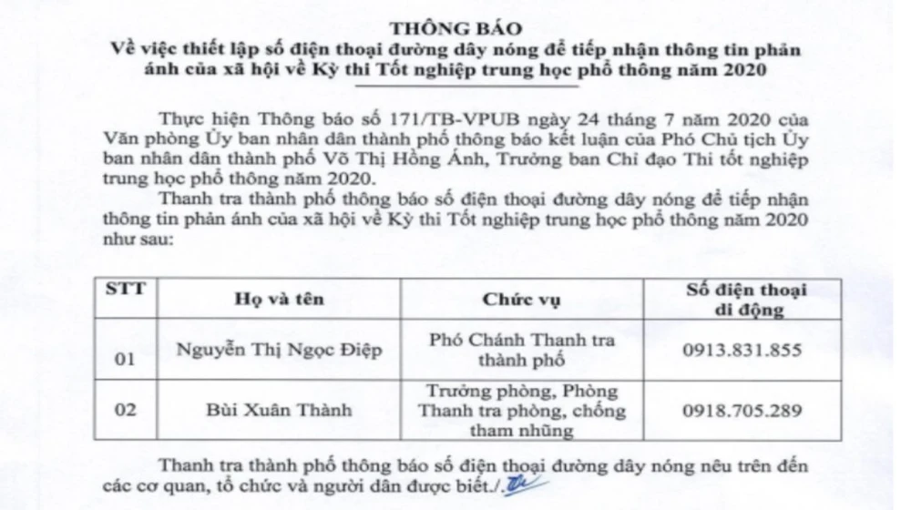 Kỳ thi tốt nghiệp THPT năm nay, Thanh tra TP Cần Thơ có thông báo về việc thiết lập số điện thoại đường dây nóng để tiếp nhận thông tin phản ánh của xã hội về kỳ thi tốt nghiệp THPT năm 2020.