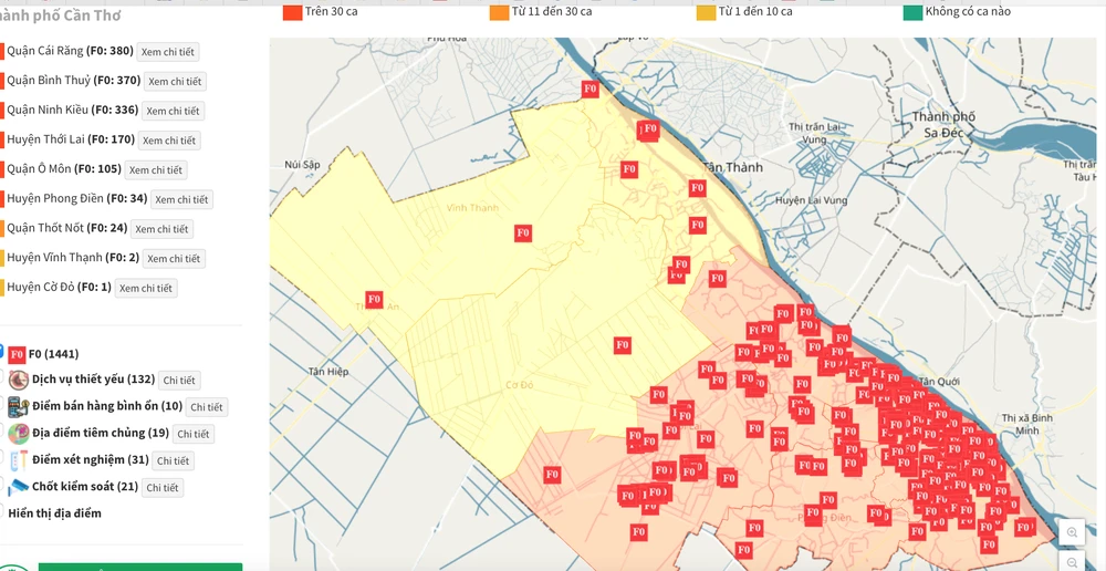 Bản đồ COVID-19 TP Cần Thơ cho thấy 9 quận huyện trên địa bàn Cần Thơ đều có ca mắc COVID-19. Ảnh: covid.cantho.gov.vn