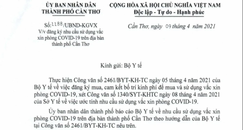 Ngày 9-4, UBND TP có văn bản gửi Bộ Y tế về việc đăng ký nhu cầu sử dụng vaccine phòng COVID-19 trên địa bàn TP Cần Thơ.