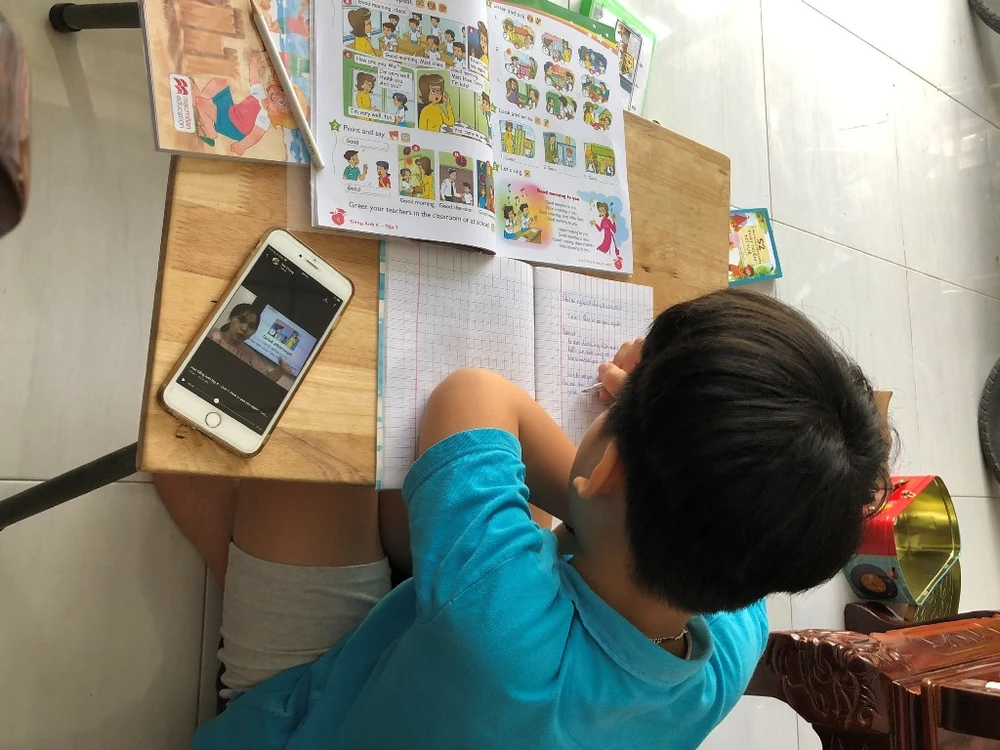 Học sinh tiểu học ở Cần Thơ tự học bài ở nhà do giáo viên chủ nhiệm chuyển qua nhóm Zalo của lớp. Ảnh: NHẪN NAM