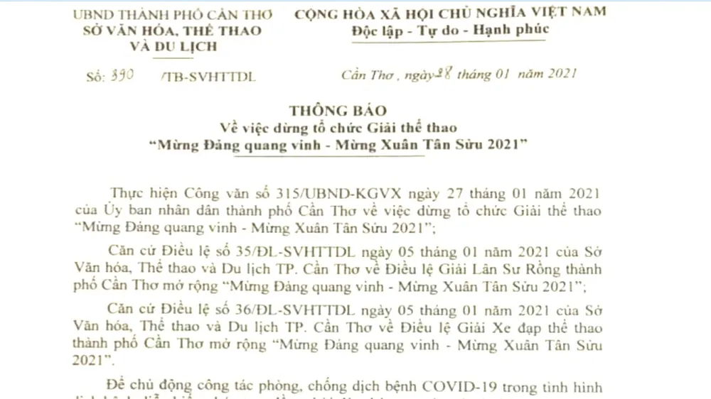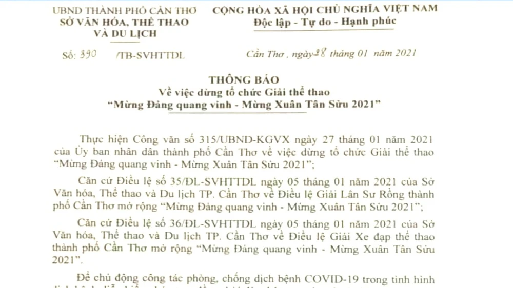 Ngày 28-1, Sở VH-TT&DL TP Cần Thơ đã ký thông báo về việc dừng tổ chức Giải thể thao “Mừng Đảng quang vinh – Mừng Xuân Tân Sửu 2021”.
