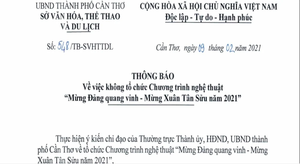 Ngày 9-2, Sở VH-TT&DL TP Cần Thơ thông báo về việc không tổ chức chương trình nghệ thuật “Mừng Đảng quang vinh – Mừng Xuân Tân Sửu năm 2021”.