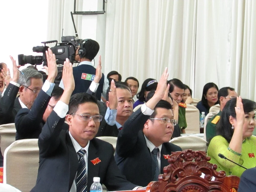 Các đại biểu giơ tay biểu quyết thông qua nghị quyết của HĐND tại kỳ họp thứ 7 HĐND TP Cần Thơ chiều 7-12. Ảnh: NN