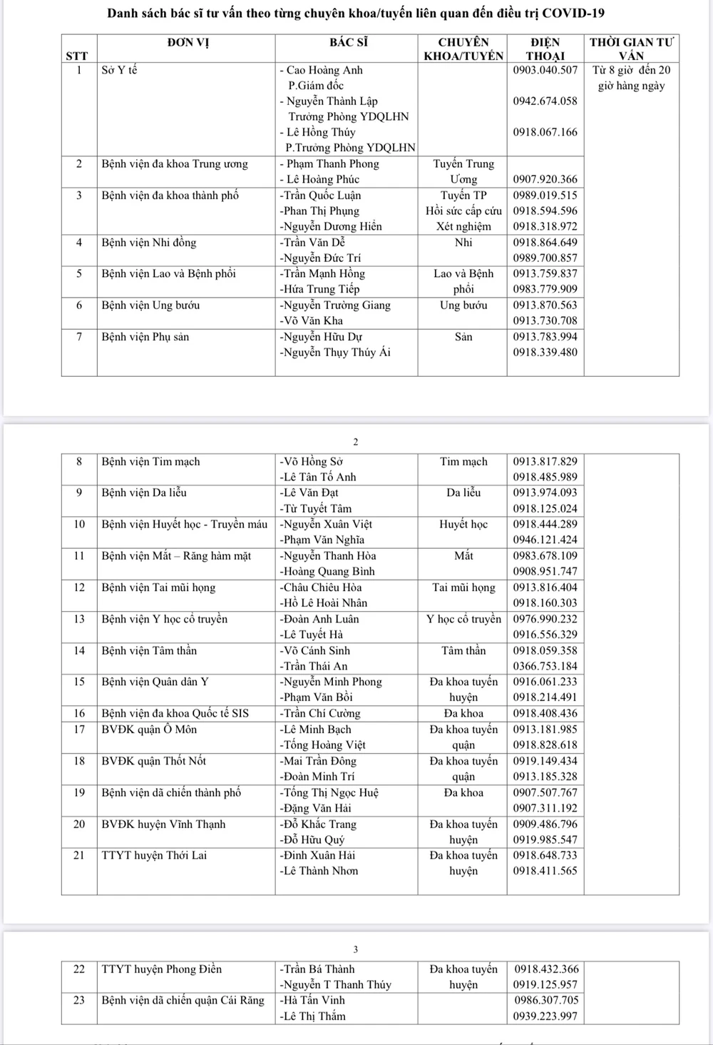 Ngày 21-7, Sở TT&TT TP Cần Thơ có công văn về việc giới thiệu danh sách bác sĩ tư vấn theo từng chuyên khoa/tuyến hỗ trợ chăm sóc sức khỏe cộng đồng trong thời gian thực hiện giãn cách xã hội liên quan dịch bện COVID-19 trên địa bàn TP Cần Thơ gửi các sở, ngành, UBND quận, huyện và báo, đài địa phương.