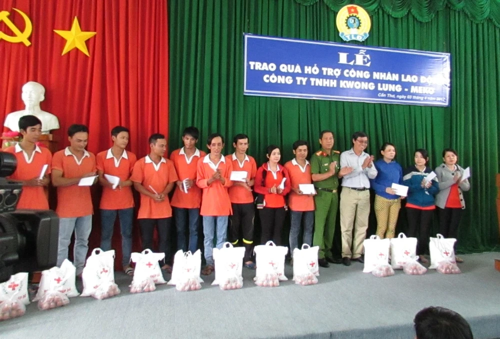 Chiều 3-4, Liên đoàn lao động TP Cần Thơ tổ chức trao quà hỗ trợ cho 930 công nhân Công ty TNHH Kwong Lung – Meko (KCN Trà Nóc, quận Bình Thủy), nơi vừa xảy ra vụ cháy lớn vào ngày 23-3.