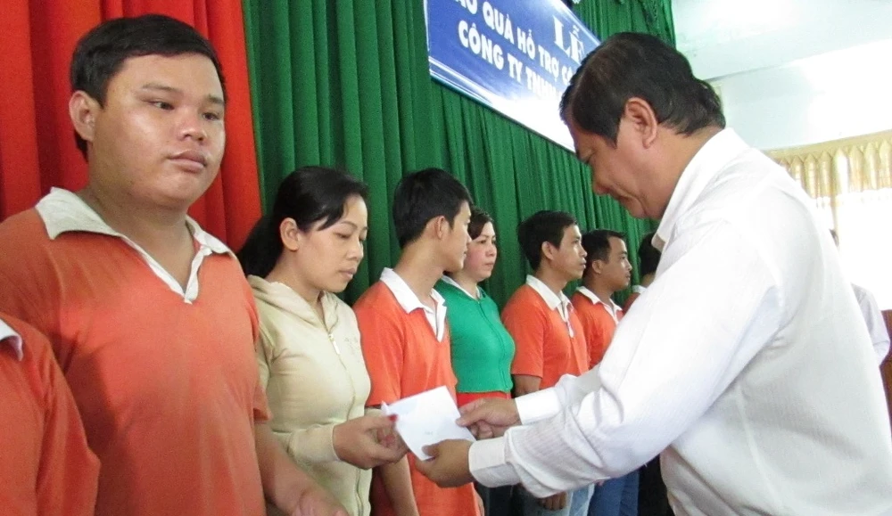 Đại diện các đơn vị, sở ngành trao quà hỗ trợ cho công nhân của Công ty TNHH Kwong Lung - Meko chiều 3-4. Ảnh: N.NAM