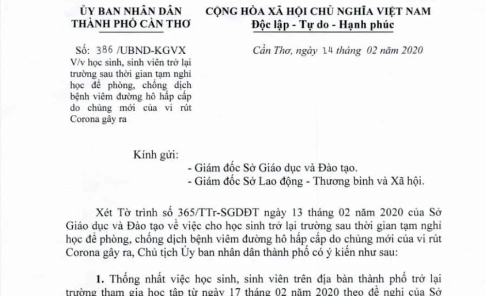 Ngày 14-2, UBND TP Cần Thơ có văn bản về việc học sinh, sinh viên trở lại trường sau thời gian tạm nghỉ học để phòng, chống dịch bệnh viêm đường hô hấp cấp do chủng mới của virus Corona gây ra (COVID-19) gửi cho giám đốc hai Sở GD&ĐT và LĐ-TB&XH.