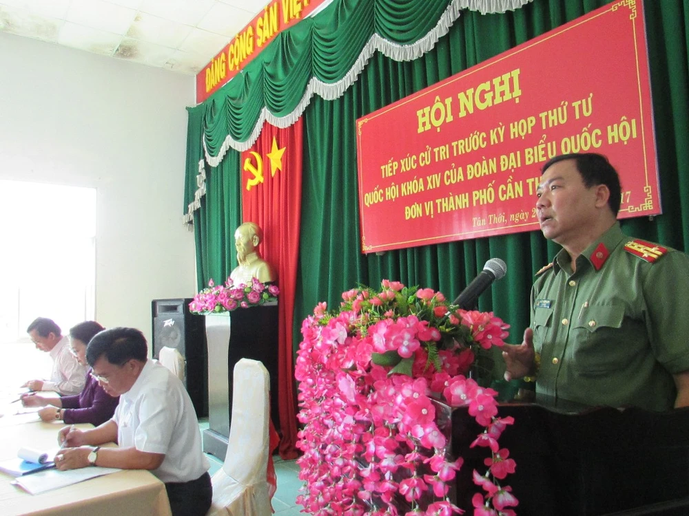 Giám đốc Công an TP Cần Thơ Trần Ngọc Hạnh phát biểu tại buổi tiếp xúc cử tri ngày 27-9. Ảnh: NN