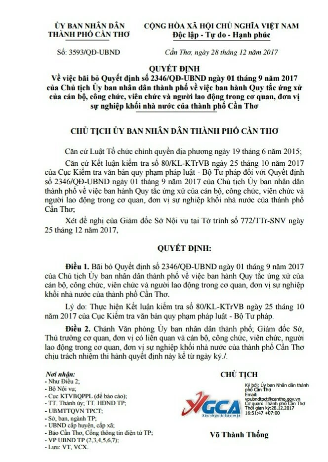 Quyết định bãi bỏ quyết định về quy tắc ứng xử của CCVC TP Cần Thơ. Ảnh: NN