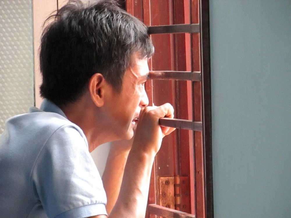 Người thân của bị cáo Đăng vịn cửa sổ khóc gọi tên bị cáo khi các bị cáo được dẫn giải ra xe phạm để về trại giam. Ảnh: NN