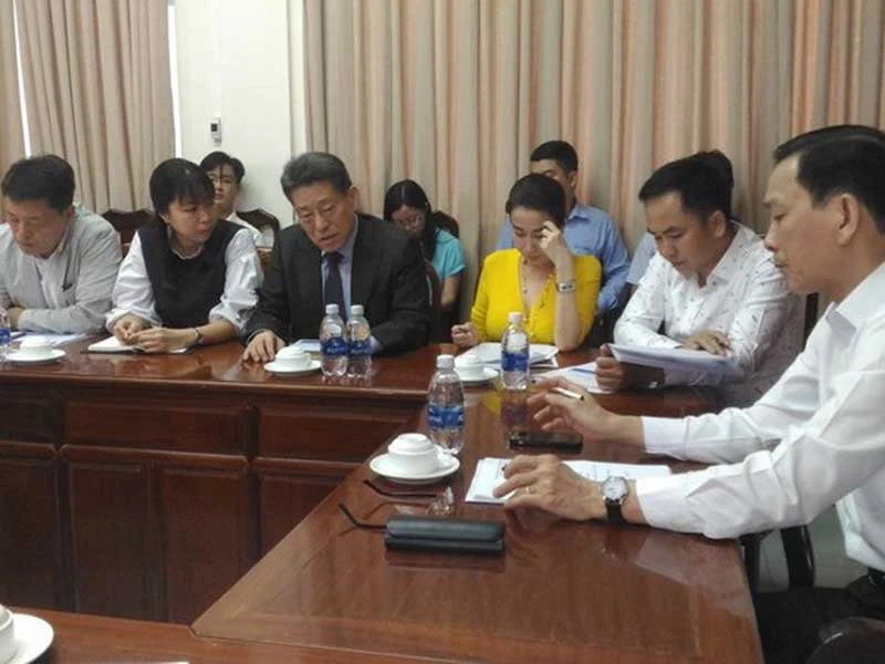 Chủ tịch UBND TP Cần Thơ Võ Thành Thống (bìa phải) đang ghi nhận các ý kiến của nhà đầu tư Hàn Quốc tại buổi làm việc chiều 31-10. Ảnh: NHẪN NAM