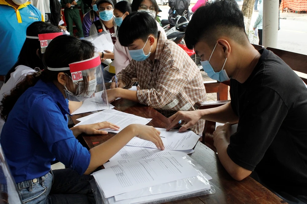Hướng dẫn thí sinh tự do thi tốt nghiệp THPT năm 2021ở Cần Thơ khai báo y tế trước khi vào làm test nhanh COVID-19. Ảnh: NHẪN NAM