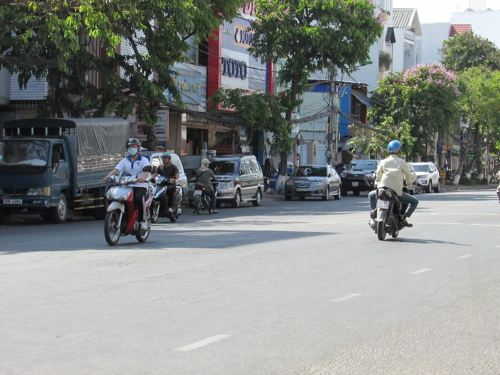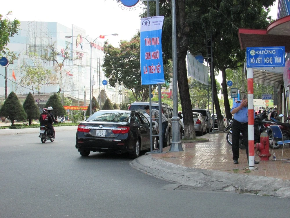 Đường Lý Tự Trọng, một trong bốn tuyến đường làm điểm lập lại trật tự lòng, lề đường. Chiều 8-3, đường này cũng có nhiều xe đậu dưới lòng đường. Ảnh: N.NAM