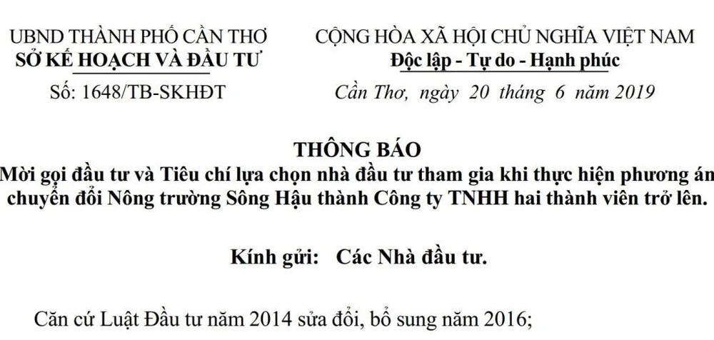 Theo thông báo, để tạo thuận lợi cho các Nhà đầu tư nghiên cứu, tham gia tái cơ cấu Nông trường Sông Hậu góp phần phát triển kinh tế-xã hội của địa phương, đáp ứng nhu cầu của TP Cần Thơ đối với hoạt động của Nông trường trường Sông Hậu. UBND TP Cần Thơ mời gọi các nhà đầu tư (có các tiêu chí đi kèm – PV) quan tâm tham gia đầu tư, tái cơ cấu Nông trường Sông Hậu, gửi hồ sơ đăng ký tham gia về Phòng Đăng ký Kinh doanh - Sở Kế hoạch và Đầu tư TP Cần Thơ. Số lượng hồ sơ 15 bộ.