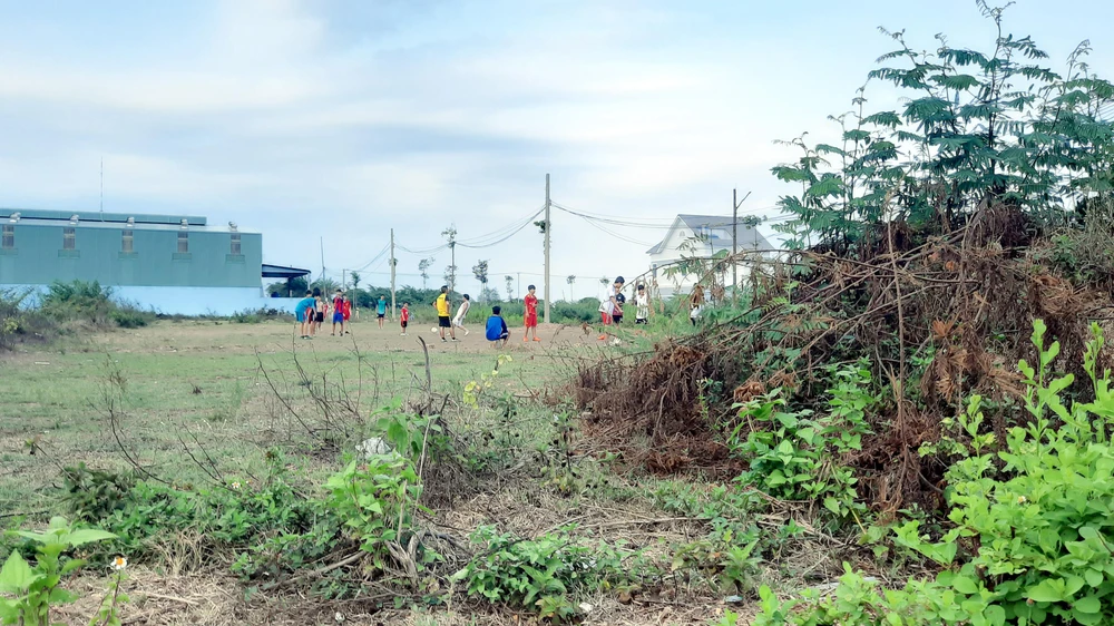Một nhóm thanh thiếu niên hơn 20 người tập trung chơi bóng đá, không đeo khẩu trang.
