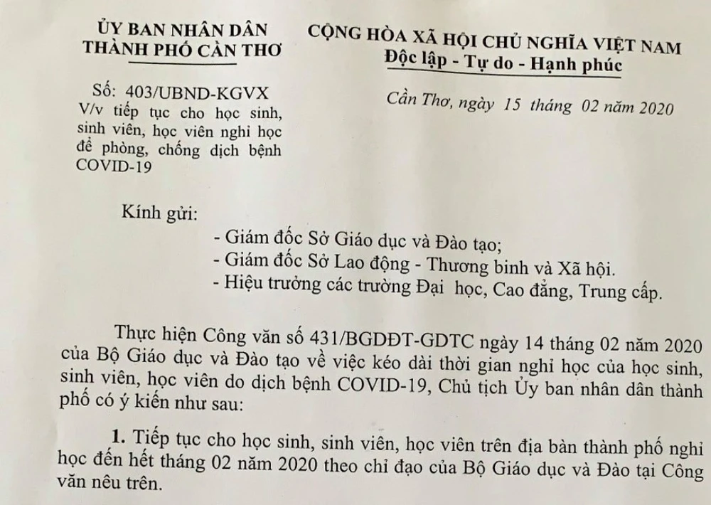 Văn bản của UBND TP Cần Thơ về việc cho học sinh nghỉ đến hết tháng 2. Ảnh: NN