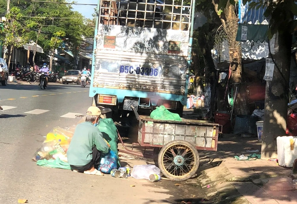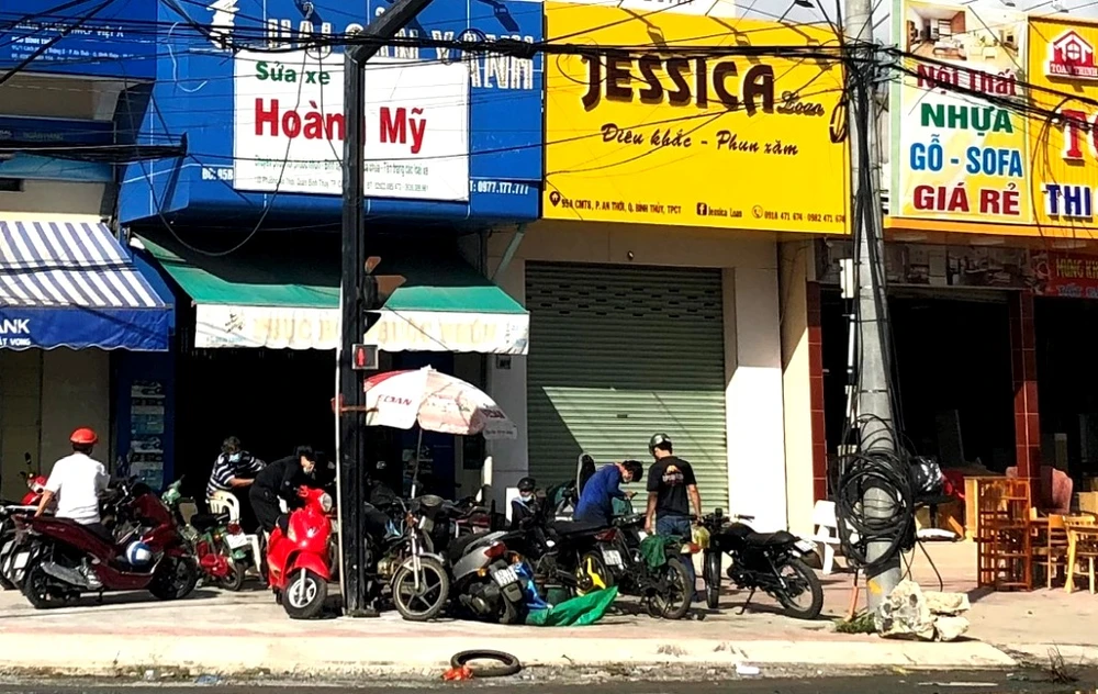 Các quán bán đồ ăn, thực phẩm, tạp hóa vẫn thực hiện giăng dây giữ khoảng cách với người mua hàng. Tiệm sửa xe mở cửa với khá nhiều khách hàng tới làm dịch vụ. Trong đó, đáng chú ý là người mua ve chai, người bán hàng rong đã bắt đầu ra đường mưu sinh trở lại.
