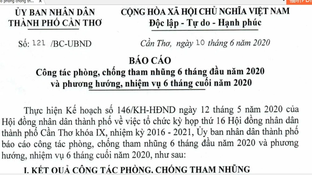 UBND TP Cần Thơ mới ban hành báo cáo về công tác phòng, chống tham nhũng 6 tháng đầu năm 2020 và phương hướng, nhiệm vụ 6 tháng cuối năm 2020.