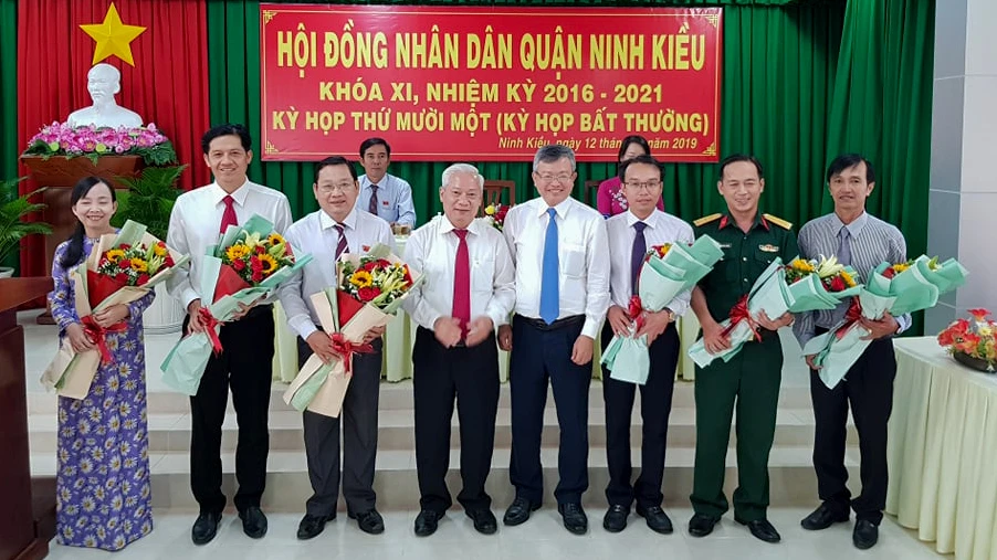 Ông Huỳnh Trung Trứ (thứ hai từ trái sang), được đại biểu HĐND quận Ninh Kiều bầu giữ chức chủ tịch UBND quận.