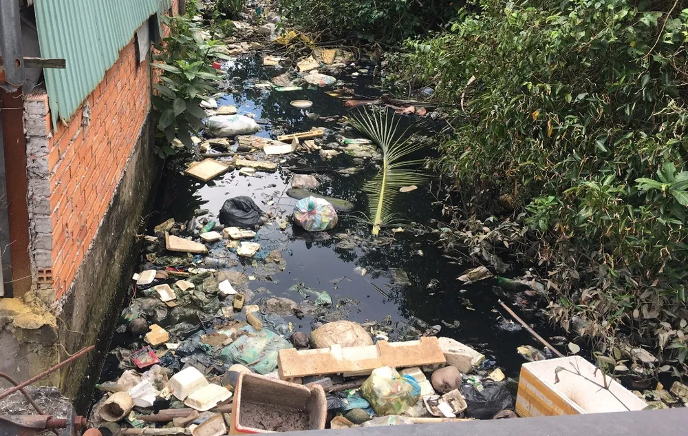 Rác thải sinh hoạt tràn kín mặt một con kênh nước tù ở phường An Thới, quận Bình Thủy, TP Cần Thơ. Ảnh: NHẪN NAM