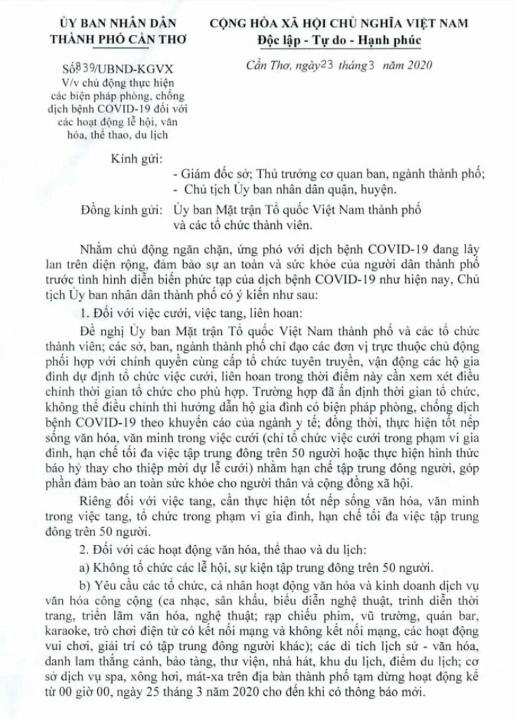 Ngày 25-3, UBND TP Cần Thơ có công văn gửi cho giám đốc sở, thủ trưởng cơ quan, ban, ngành TP, chủ tịch UBND quận, huyện, Ủy ban MTTQ Việt Nam TP và các tổ chức thành viên về việc chủ động thực hiện các biện pháp phòng, chống dịch bệnh COVID-19 đối với các hoạt động lễ hội, văn hóa, thể thao, du lịch.