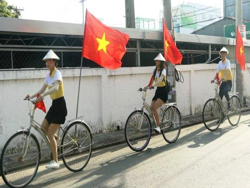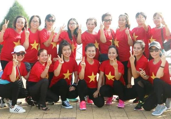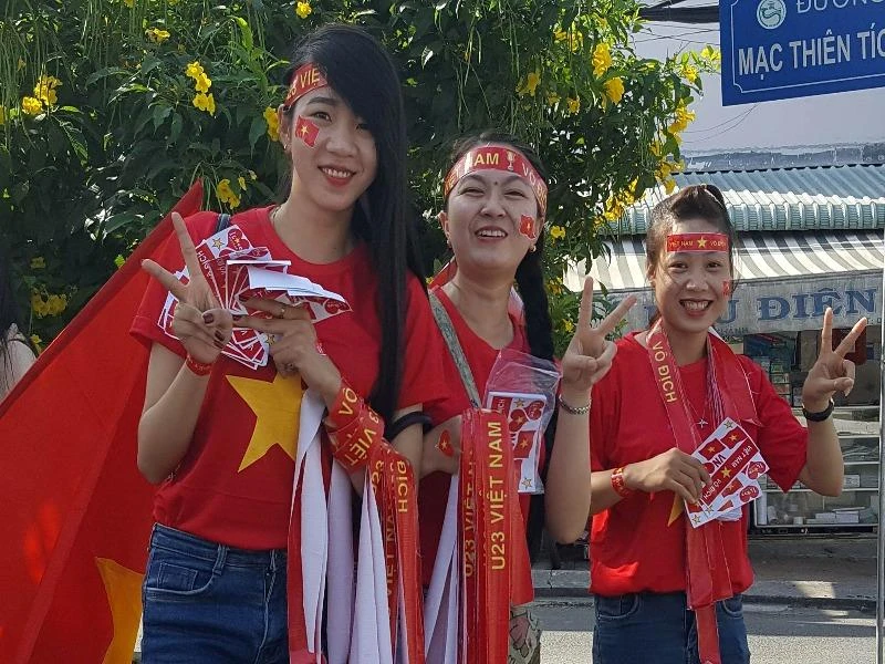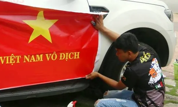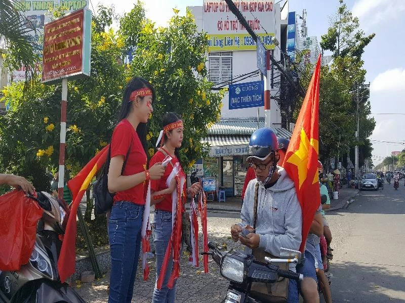 Trưa 27-1, hàng loạt điểm bán cờ, băng đeo, áo có in hình cờ đỏ sao vàng và dòng chữ “Việt Nam vô địch” tấp nập người mua.