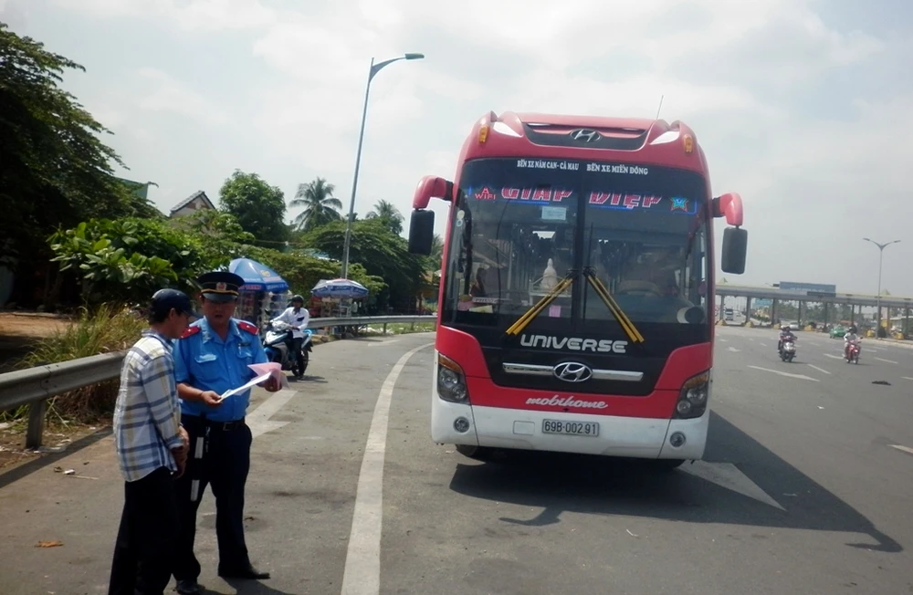 Thanh tra Sở GTVT Cần Thơ kiểm tra, lập biên bản xử phạt xe khách vi phạm trên tuyến đường dẫn cầu Cần Thơ. Ảnh: Gia Tuệ.