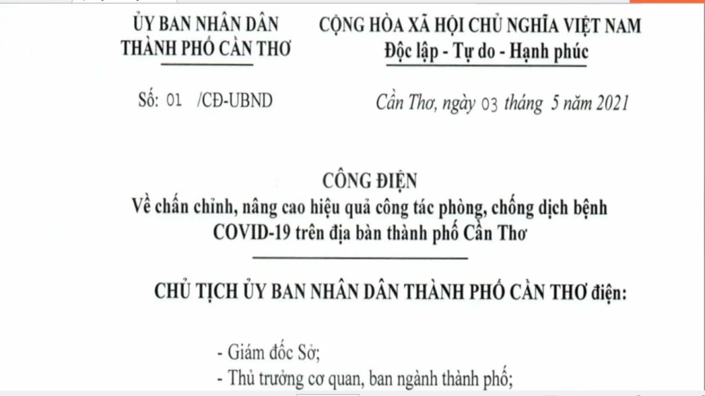 Công điện về chấn chỉnh, nâng cao hiệu quả công tác phòng, chống dịch bệnh COVID-19 của Cần Thơ ngày 3-5. Ảnh: NN