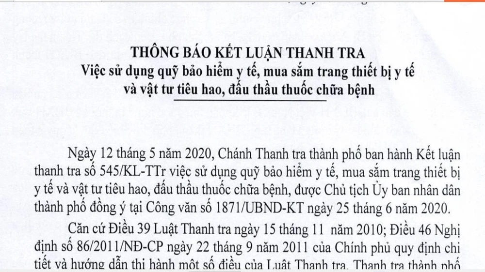 Thông báo kết luận thanh tra của Thanh tra TP Cần Thơ. Ảnh: NN