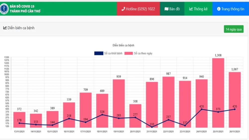 Ngày 26-11, Cần Thơ có thêm 1.067 ca nhiễm COVID-19, 420 ca được điều trị khỏi và 2 ca tử vong. Tính chung từ ngày 8-7 đến nay, TP này đã có 22.398 ca nhiễm, trong đó có 10.917 ca đã khỏi bệnh, 170 ca tử vong.