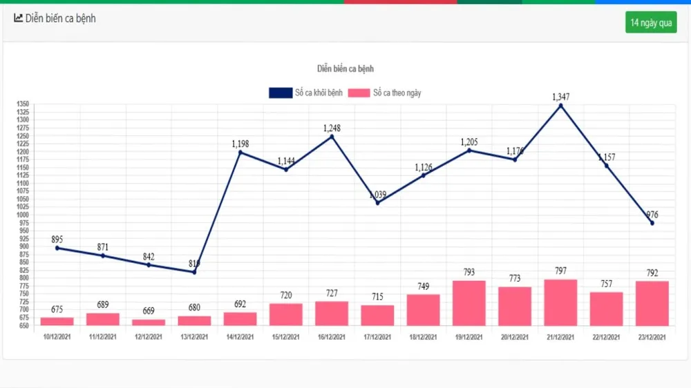 Biểu đồ ca nhiễm và khỏi bệnh trong 14 ngày qua tại TP Cần Thơ. Ảnh: Cổng thông tin COVID-19 Cần Thơ