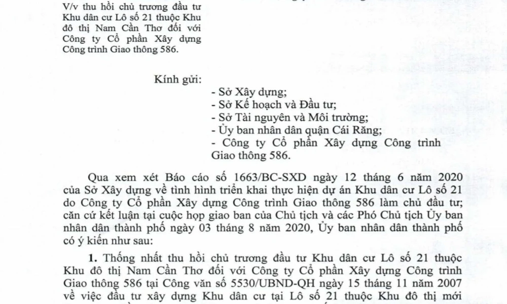 Theo đó, UBND TP Cần Thơ cho biết sau khi xem xét báo cáo của Sở Xây dựng về tình hình triển khai thực hiện dự án Khu dân cư Lô số 21 do Công ty 586 làm chủ đầu tư, căn cứ kết luận tại cuộc họp giao ban của chủ tịch và các phó chủ tịch TP, UBND TP thống nhất thu hồi chủ trương đầu tư Khu dân cư Lô số 21 đối với Công ty 586.