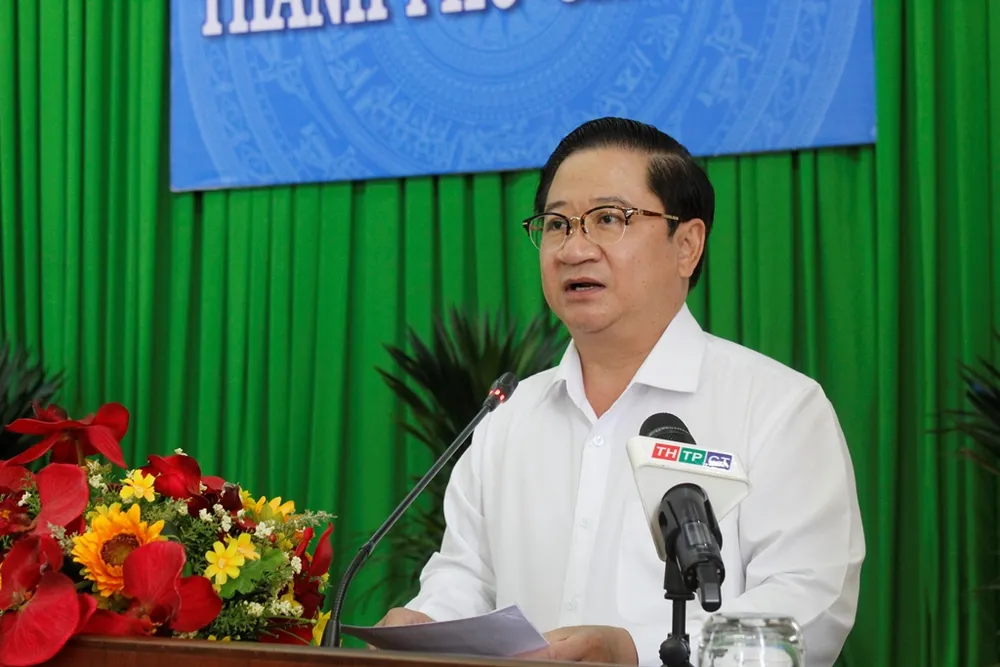 Chủ tịch UBND TP Cần Thơ Trần Việt Trường phát biểu tại cuộc họp ngày 29-6. Ảnh: NHẪN NAM