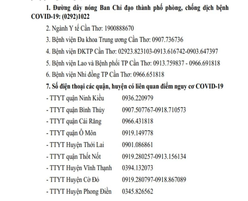 Tối 17-8, Ban Chỉ đạo phòng, chống dịch COVID-19 TP Cần Thơ thông báo cho những người có liên quan với các điểm nguy cơ COVID-19 trong khoảng thời gian từ ngày 4-8 đến ngày 17- 8, khẩn trương đến Trạm Y tế xã, phường, thị trấn nơi cư trú, tạm trú để khai báo y tế hoặc gọi điện vào số điện thoại dưới đây để được hướng dẫn các biện pháp phòng, chống dịch.