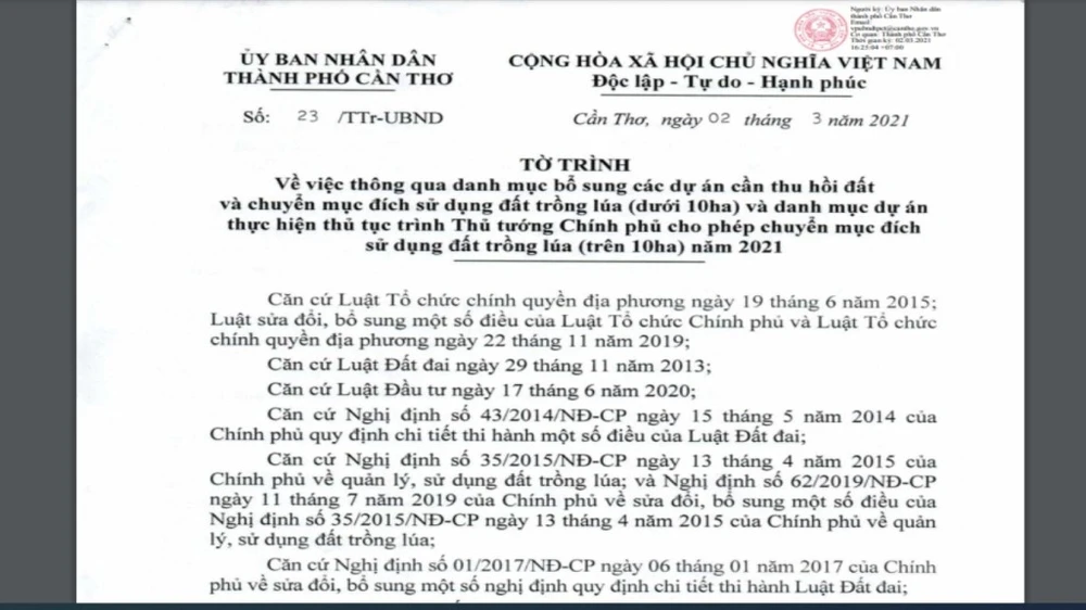 Tờ trình về danh mục bổ sung các dự án cần thu hồi đất và chuyển mục đích sử dụng đất trồng lúa của UBND TP Cần Thơ. Ảnh: NHẪN NAM