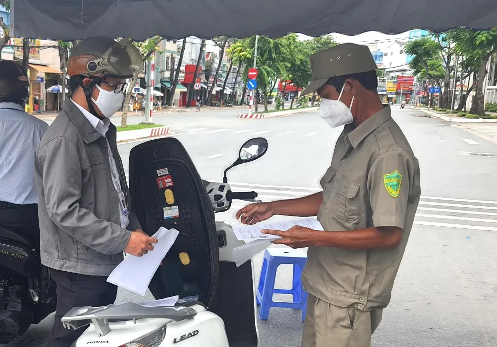 Người dân trình giấy đi đường khi qua chốt kiểm soát trên địa bàn TP Cần Thơ. Ảnh: NAM GIAO