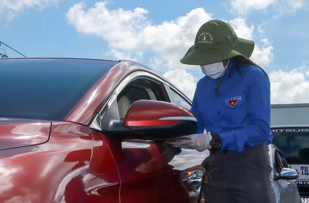 Tình nguyên viên ở Cần Thơ tham gia ghi thông tin các phương tiện tại chốt kiểm soát phòng, chống dịch. Ảnh: CHÂU ANH
