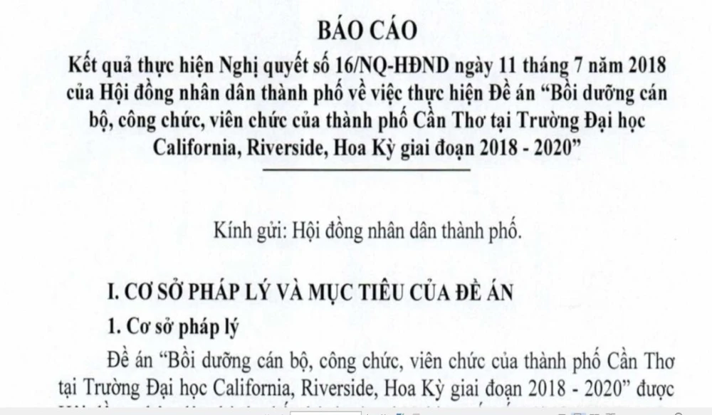 Báo cáo về Đề án đưa cán bộ, công chức đi học bồi dưỡng ở Mỹ của UBND TP Cần Thơ. Ảnh: NHẪN NAM