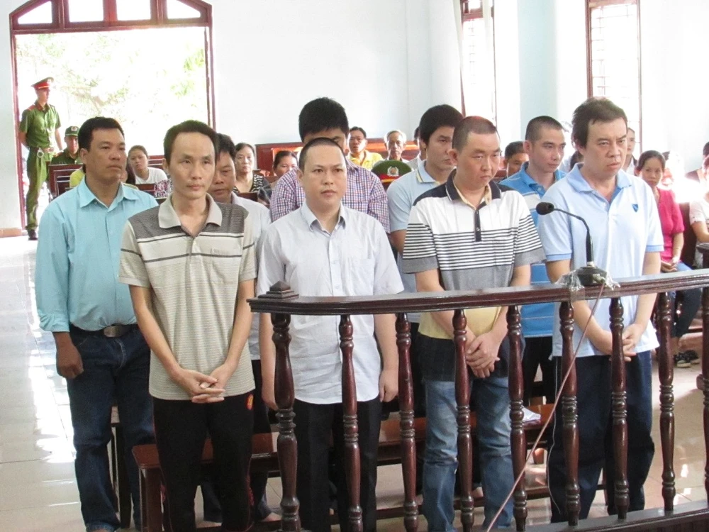 Chín bị cáo tại phiên tòa sáng nay (11-7). Ảnh: NN