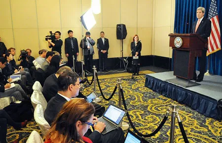 Ngoại trưởng John Kerry phát biểu tại cuộc họp báo ở Bắc Kinh đêm 14-2. Ảnh: BỘ NGOẠI GIAO MỸ