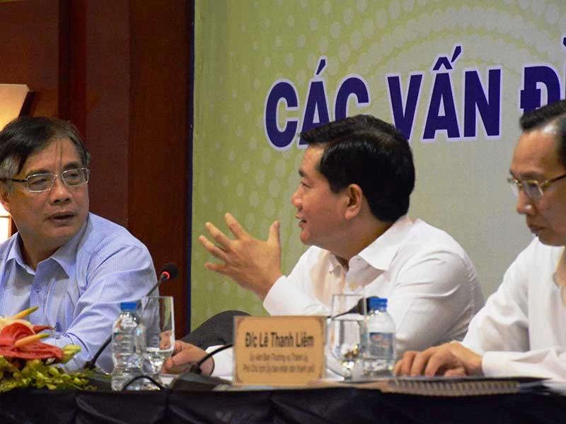 Bí thư Thành ủy TP.HCM Đinh La Thăng đang trao đổi với PGS-TS Trần Đình Thiên, Viện trưởng Viện Kinh tế Việt Nam, tại hội thảo. Ảnh: T.LÂM