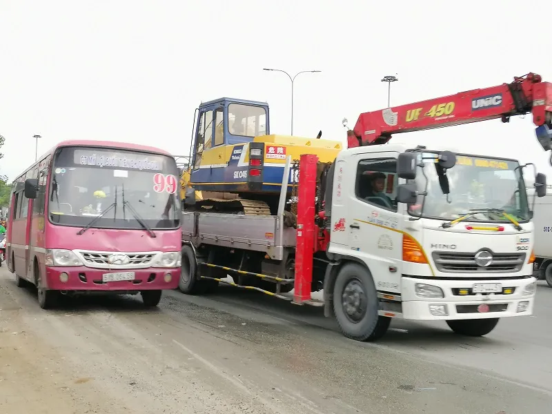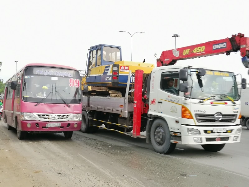 Xe buýt, xe đầu kéo chen chúc nhau vượt qua nhau.