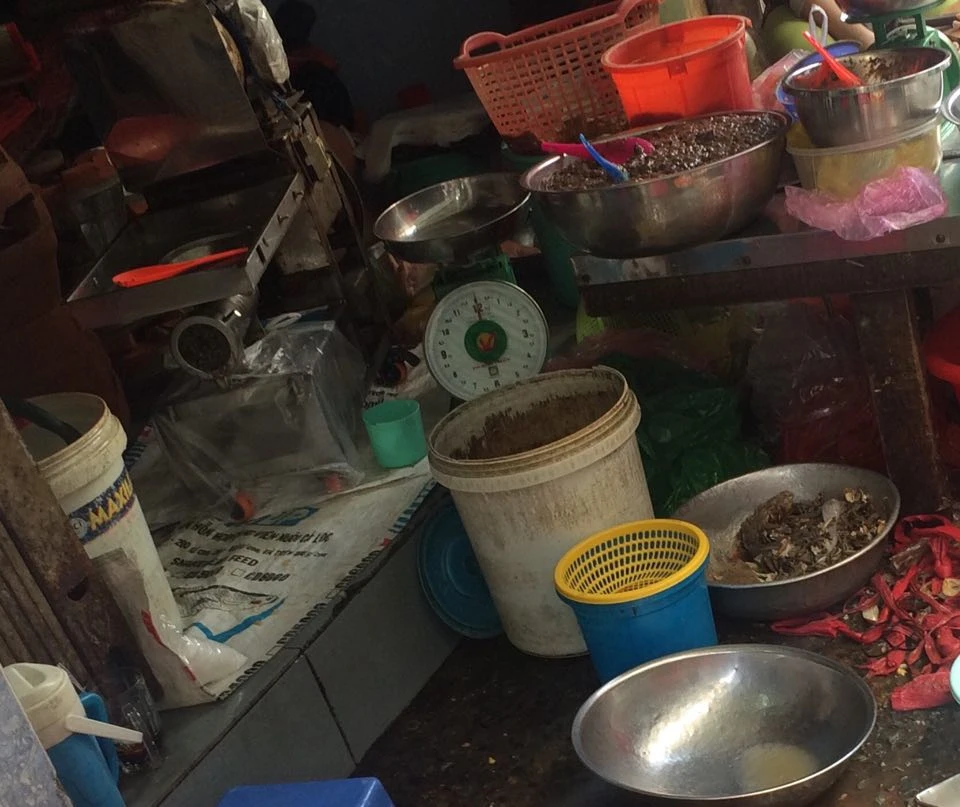 Đứng quan sát thêm một lúc, người bán bỏ lẫn cua sống và chết xay chung với nhau rồi đổ ra thau đã xay sẵn. Khi có khách hàng nào đến mua, nếu không muốn lấy cua xay sẵn thì chủ sạp chọn vài con cua sống lẫn vài con cua chết trong thau nhúng nước sơ qua nước, bóc vỏ sơ và bỏ vào máy xay. Trong khi khâu chế biến cua là rất quan trọng. Bên cạnh cua là một máy xay có nhiều ruồi bâu.